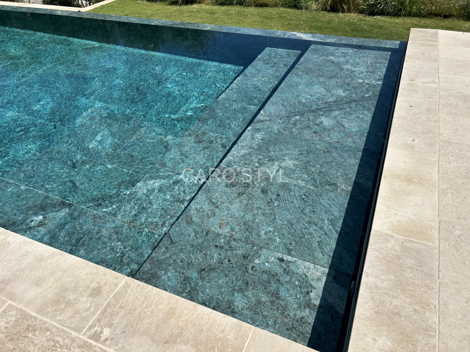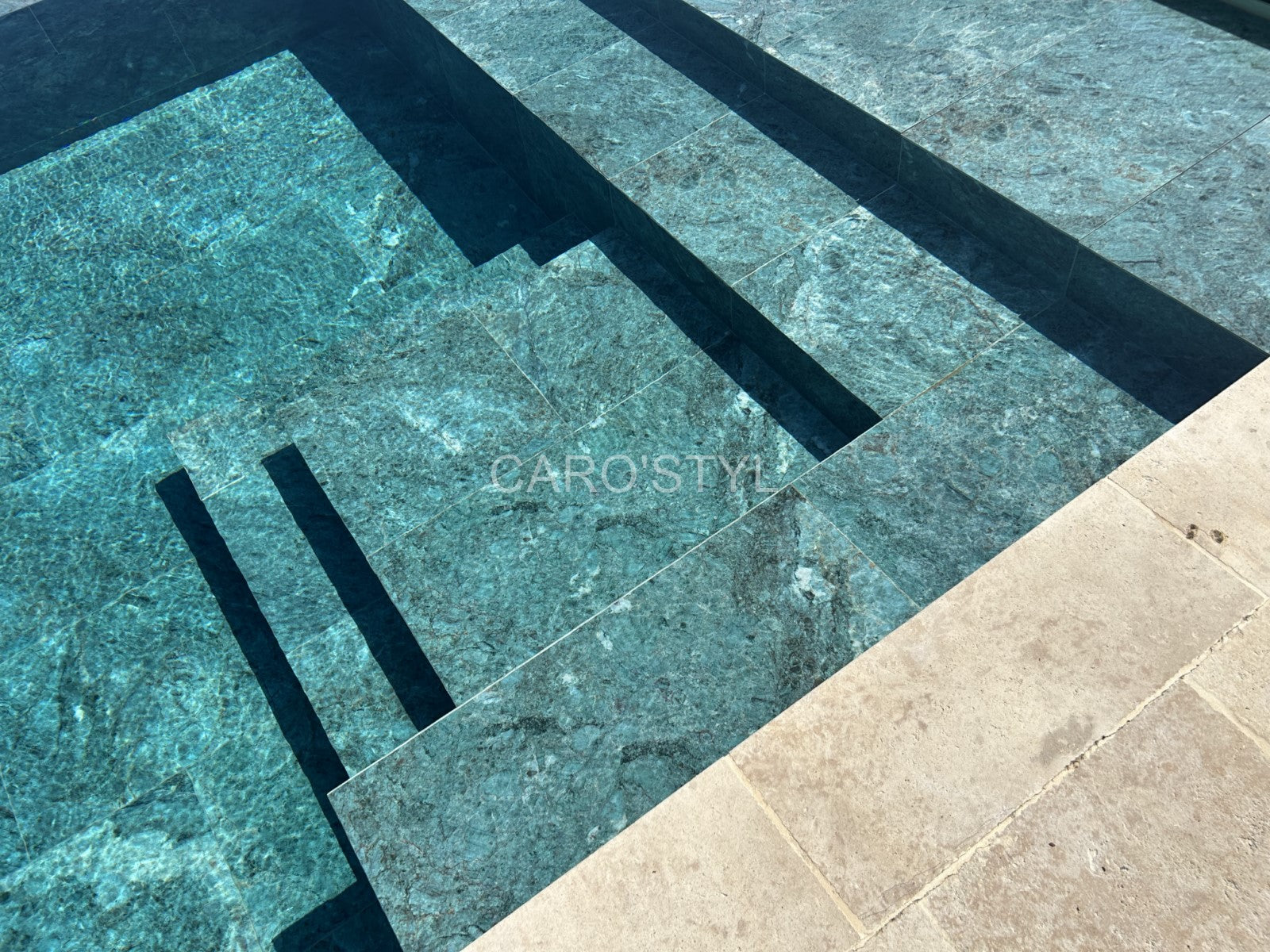 Le carrelage Abysses Émeraude effet marbre pour piscine – Un vert profond et raffiné qui transforme votre bassin en écrin naturel. Résistant, ingélif et facile à entretenir, il convient aux piscines, plages, escaliers immergés et espaces bien-être.